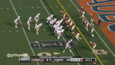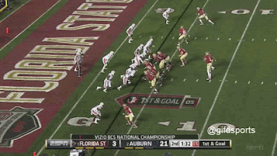 7:04 SECOND QUARTER – Jameis Winston and Red Lightening lumber their way down to the Auburn 3-yard line.