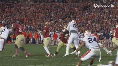 7:01 SECOND QUARTER – FSU running back, Devonta Freeman laid out by Auburn linebacker, Kris Frost.